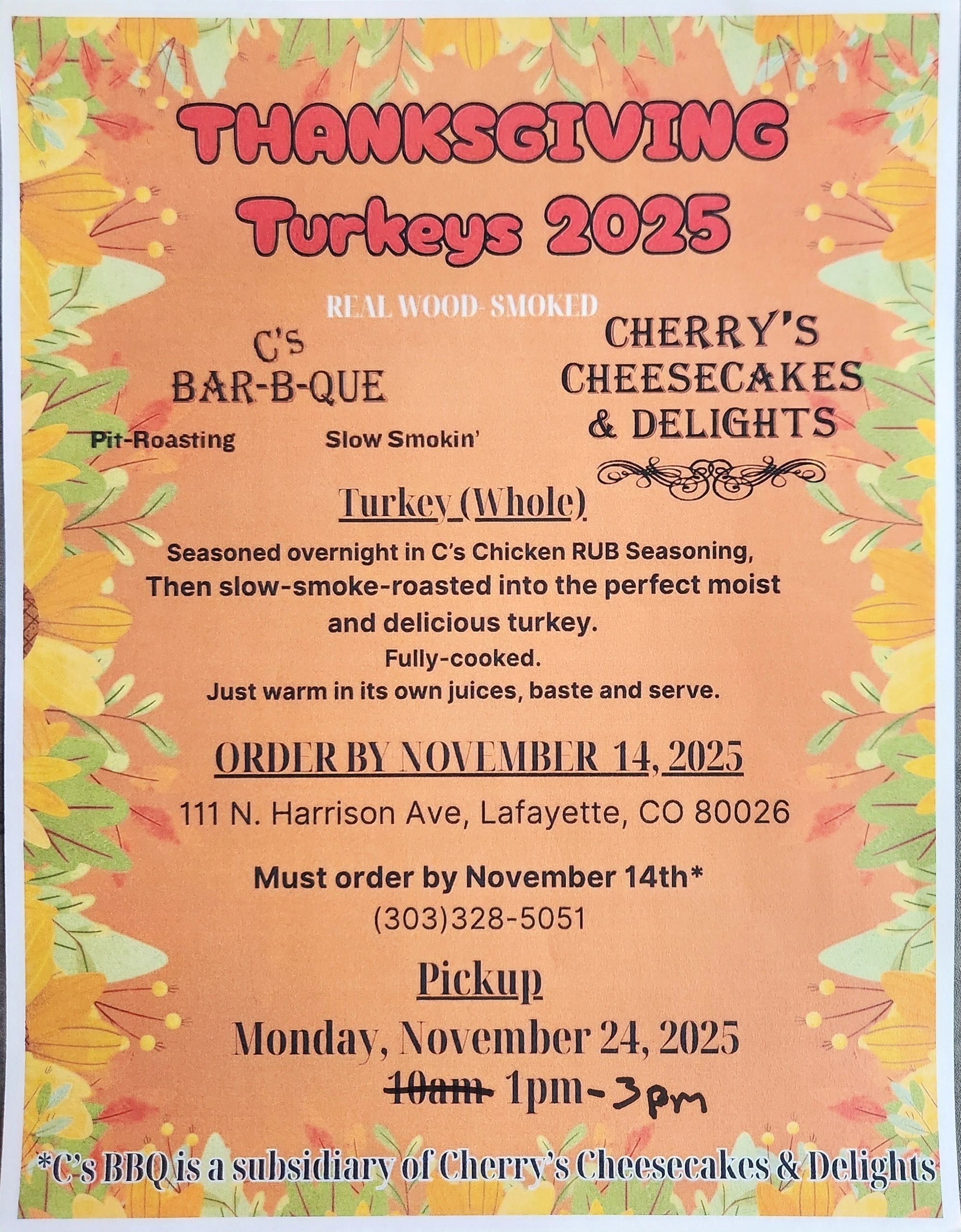 Order Turkeys, Dressing, Mac & Cheese, Mashed Potatoes, and Milk Rolls by November 14th and pickup is Monday November 24th